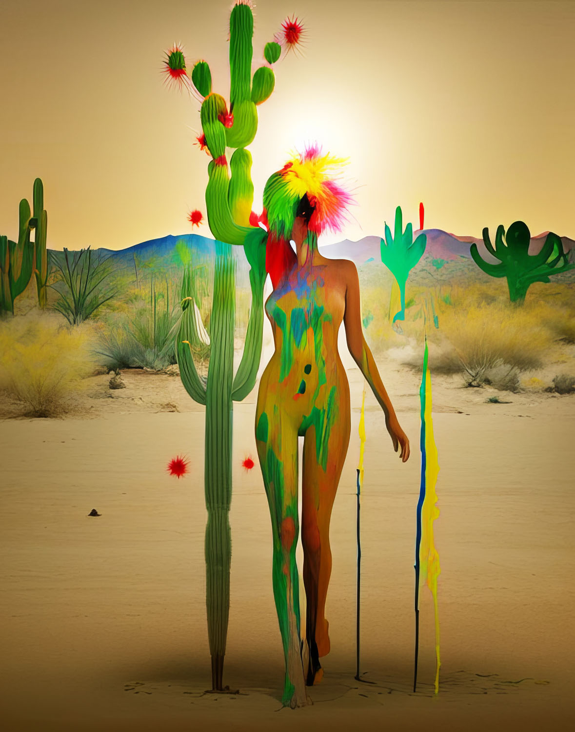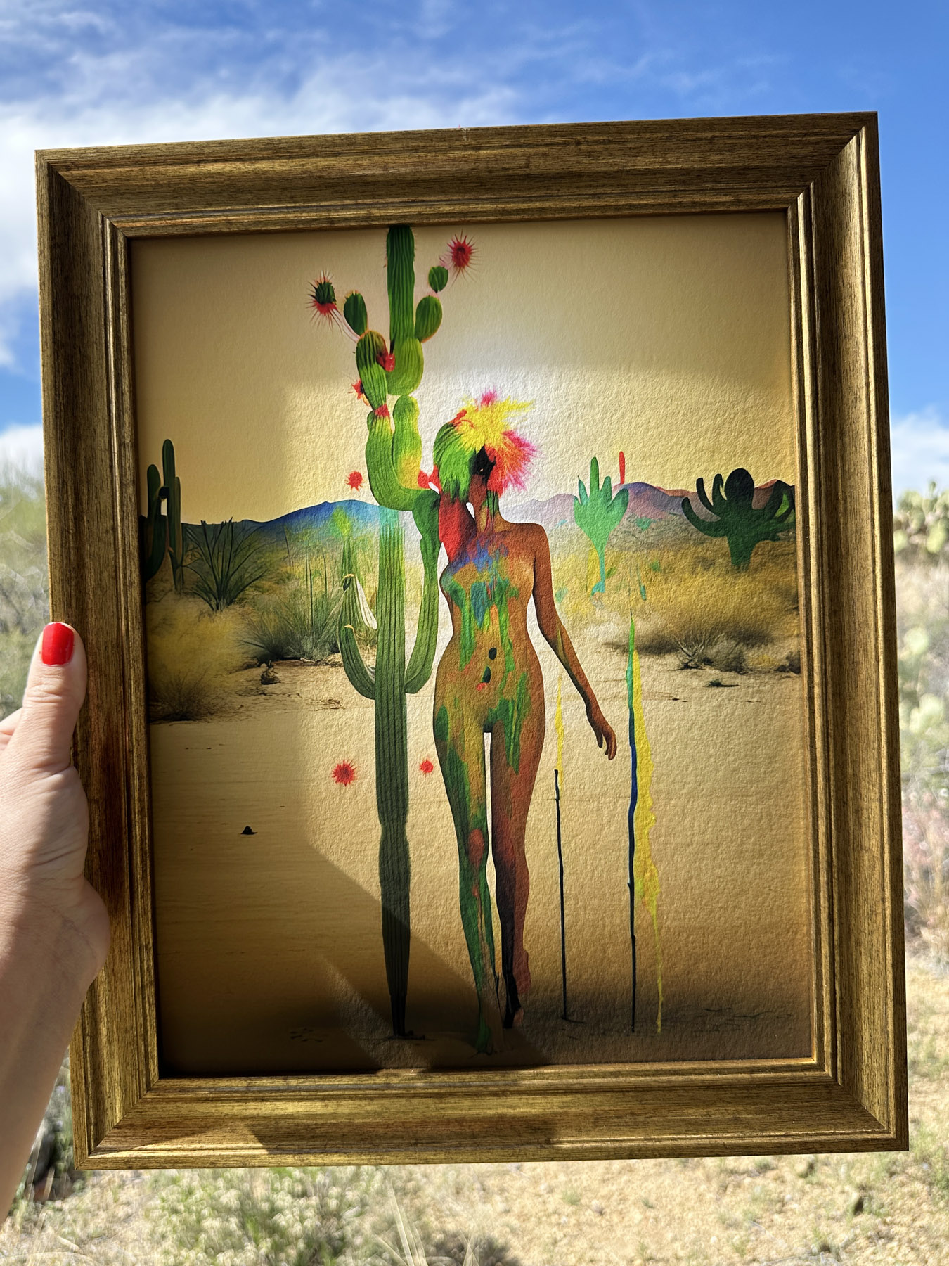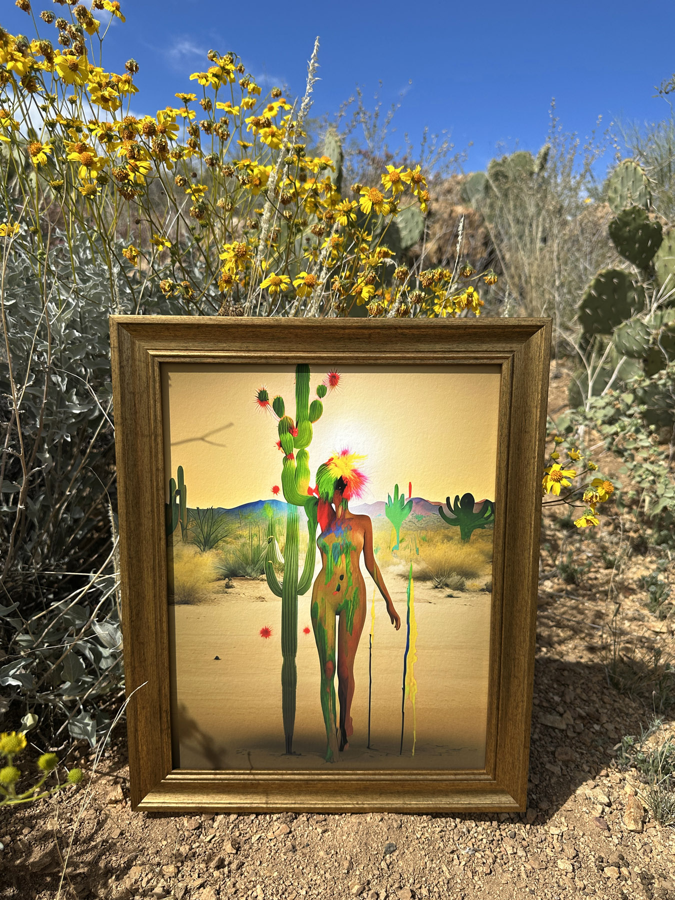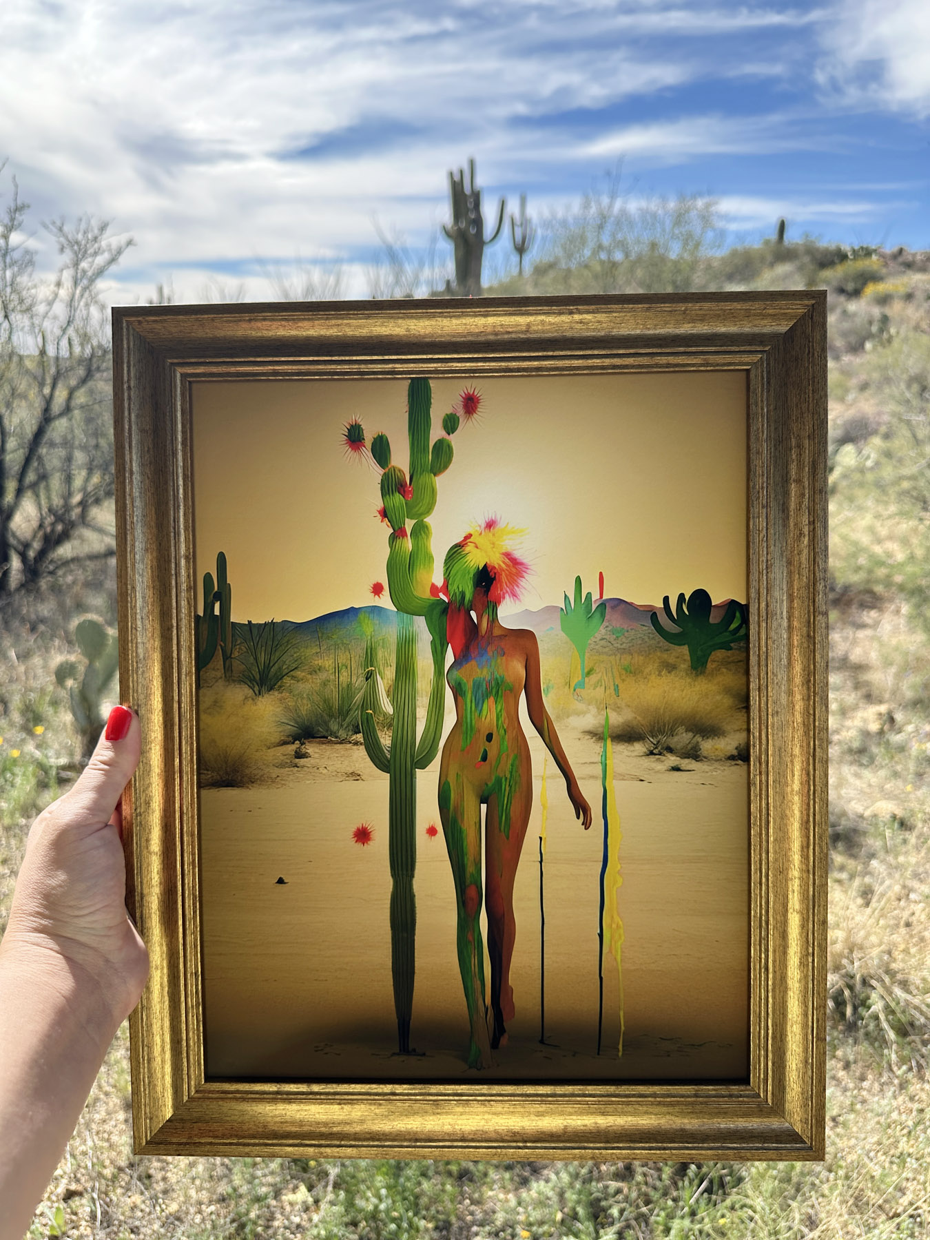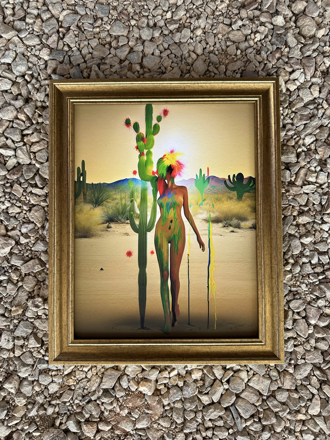 Nativity is 11×14 inches and comes in a similar gold frame. This artwork starts as a photograph I have taken, is digitally manipulated on my computer, and is printed on my home Epson printer using archival pigment ink on Hahnemühle Agave paper. It is an edition of 10. Made in 2024. Comes with Certificate of Authenticity.